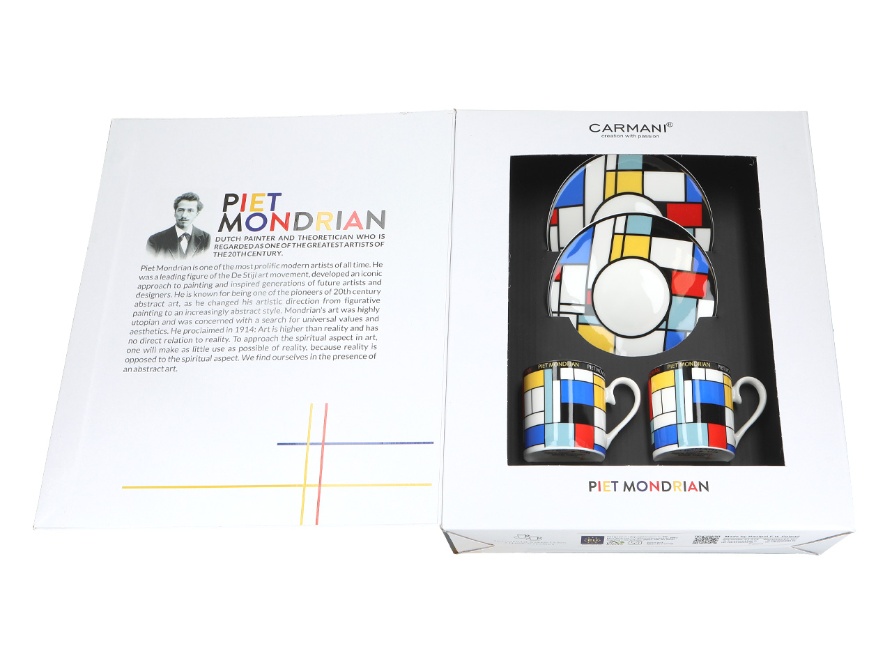 Prosty kształt filiżanki oraz oryginalne, nowoczesne wzornictwo, to świetny pomysł na prezent dla miłośników sztuki współczesnej. Tym bardziej, że Modrian miał ogromny wpływ na rozwój abstrakcjonizmu w malarstwie.