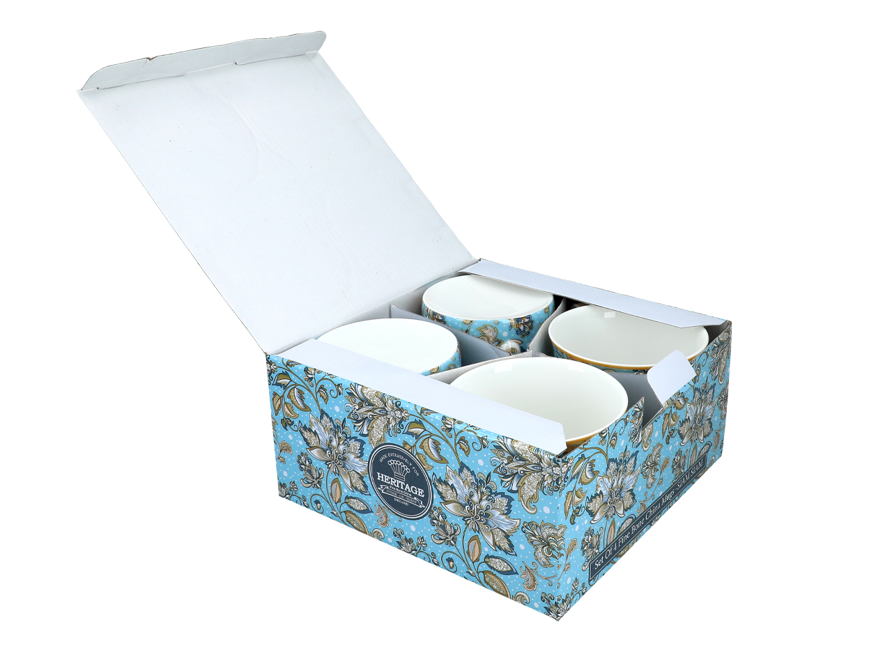 Zestaw czterech porcelanowych kubków o pojemności 295ml, każdy z unikalną kwiatową ilustracją. Kubki są trwałe, wygodne i idealne do codziennego użytku.