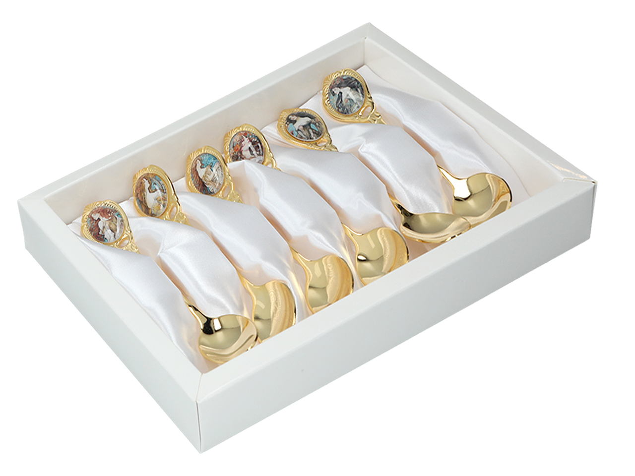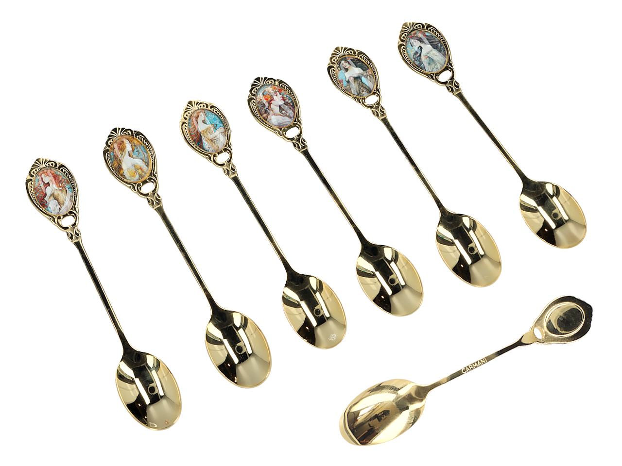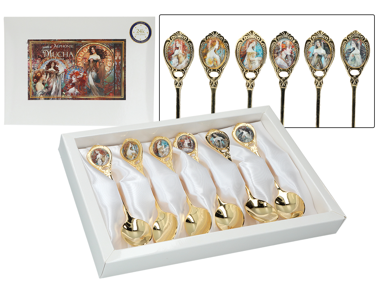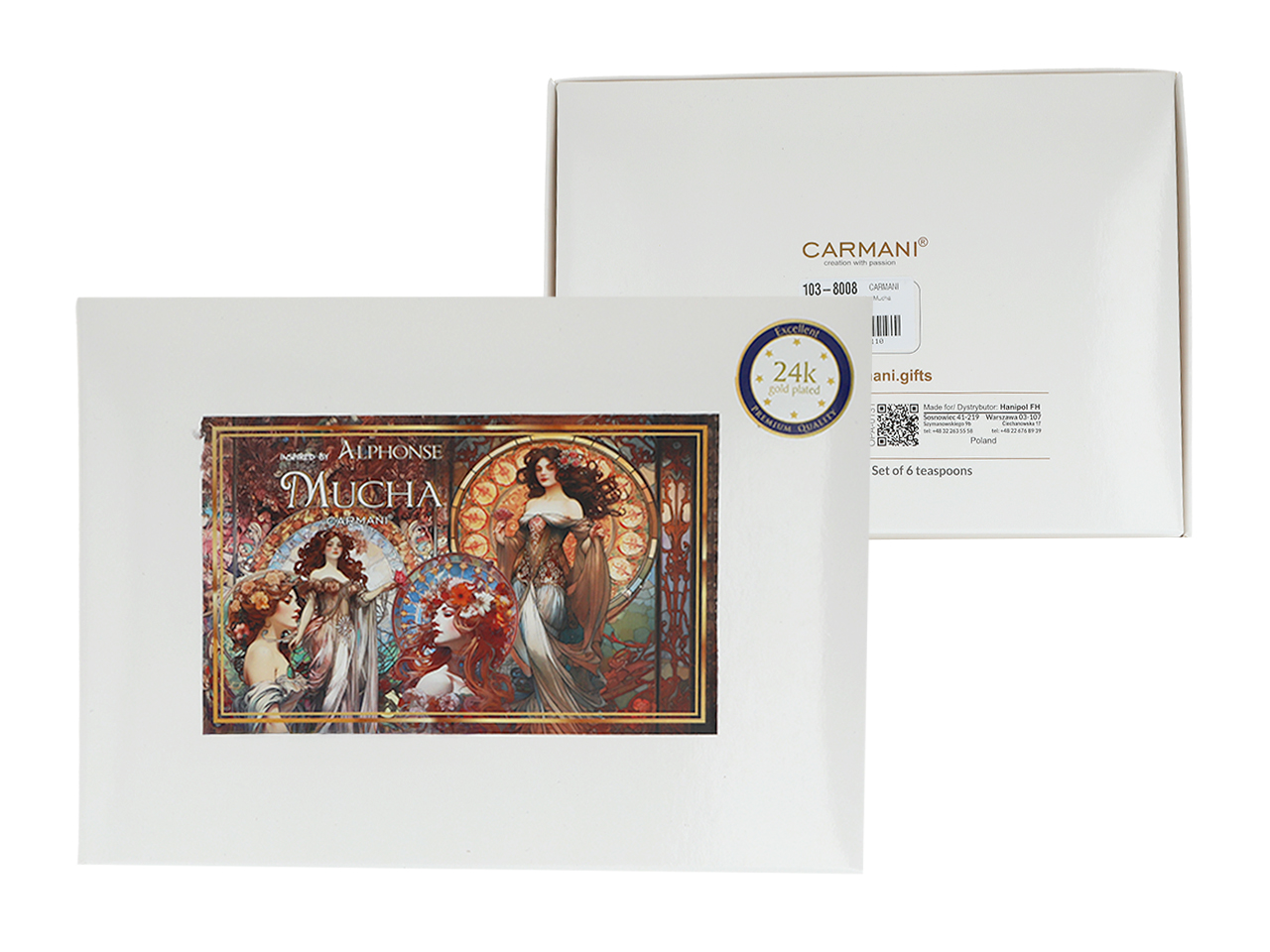 Zestaw składa się z 6 ozdobnych łyżeczek w kolorze złotym, dekoracje nawiązują do malarstwa Alfonsa Muchy. Zapakowane w białe, eleganckie pudełko.