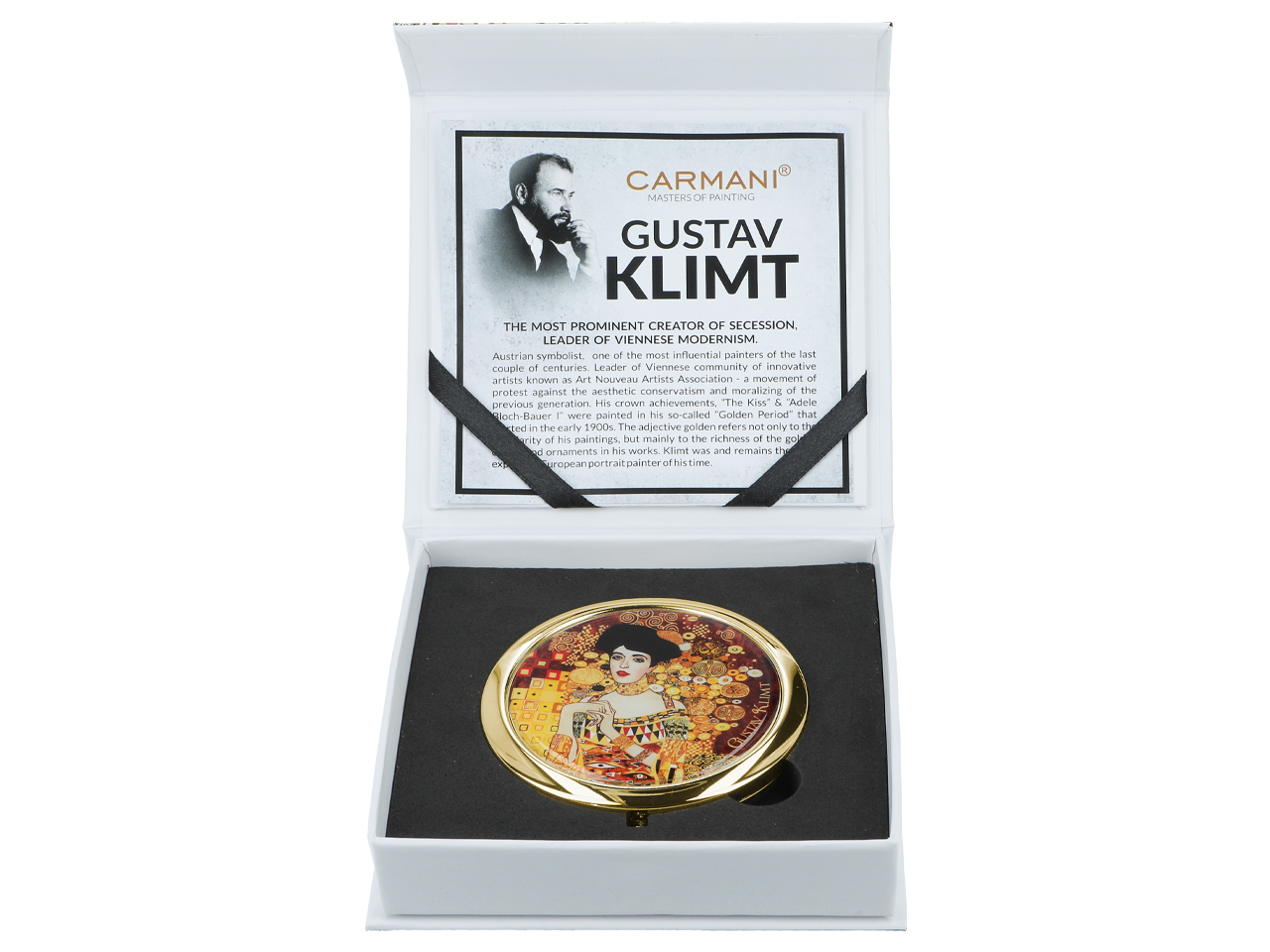 Urocze, małe lustereczko z motywem twórczości Gustava Klimta. Doskonałe do każdej kobiecej torebki. Zajmuje mało miejsca a jego piękne zdobienia dodają uroku.