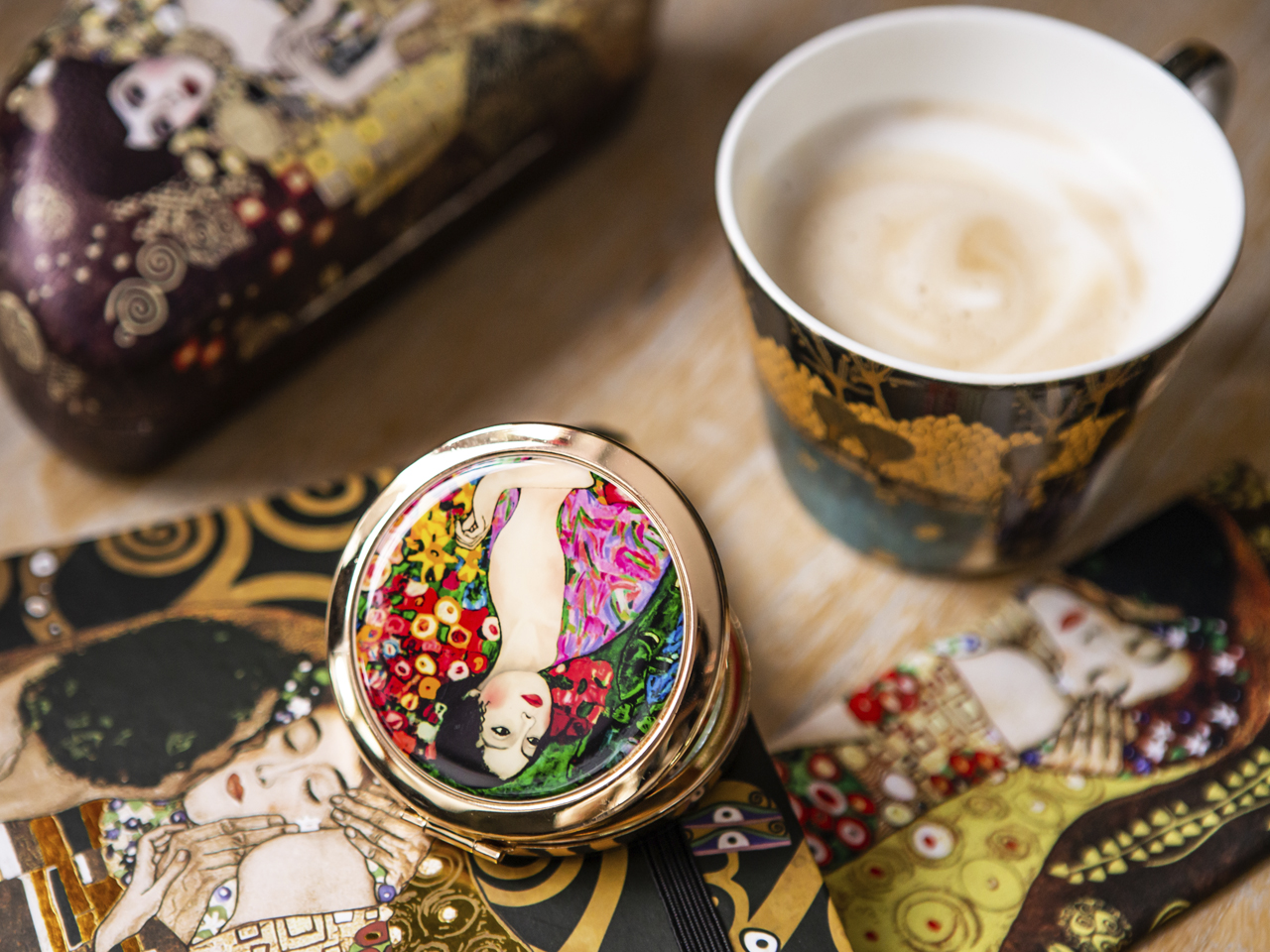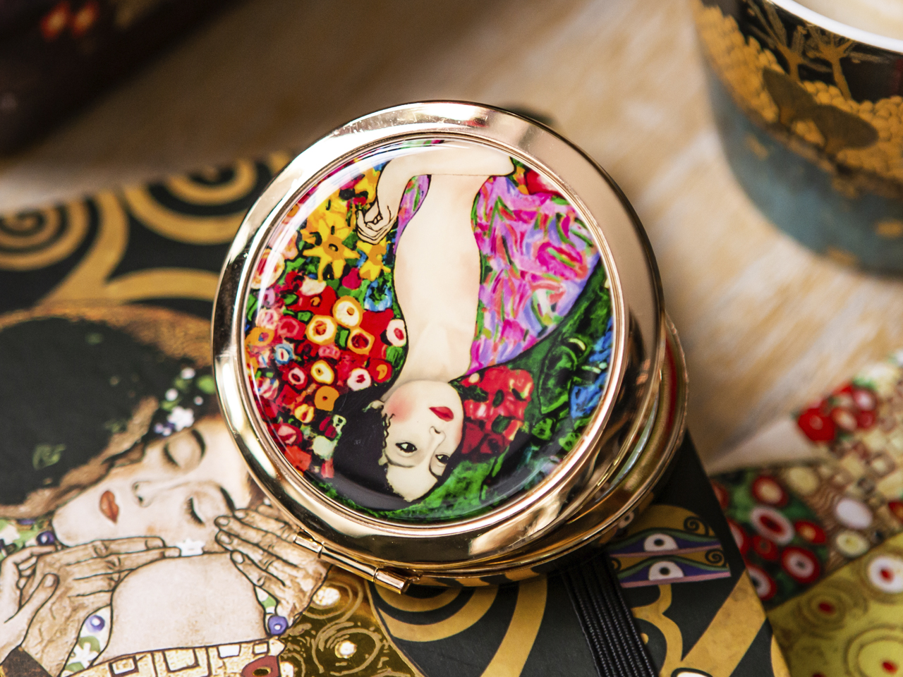 Urocze, małe lustereczko z motywem twórczości Gustava Klimta. Doskonałe do każdej kobiecej torebki. Zajmuje mało miejsca a jego piękne zdobienia dodają uroku.