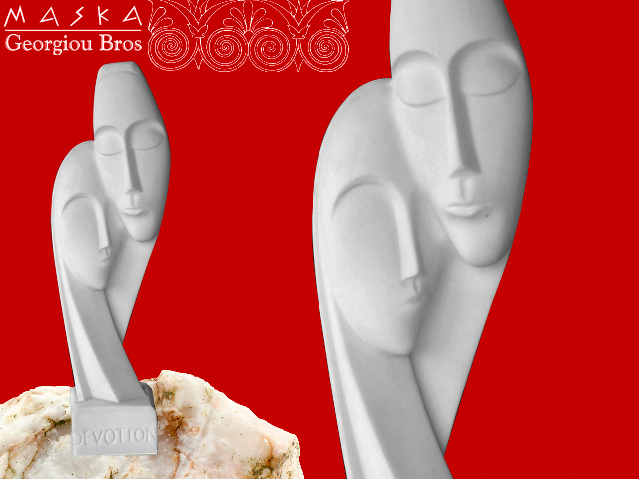 Alabastrowa figurka przedstawiająca dwie maski. przytulone niczym para kochanków. Od czasów starożytnych alabaster był wysoko cenionym kamieniem ozdobnym i dekoracyjnym. Niezliczona ilość wzorów jest inspiracją do tworzenia