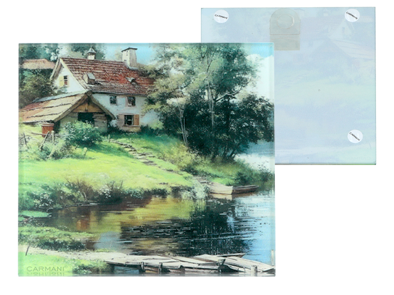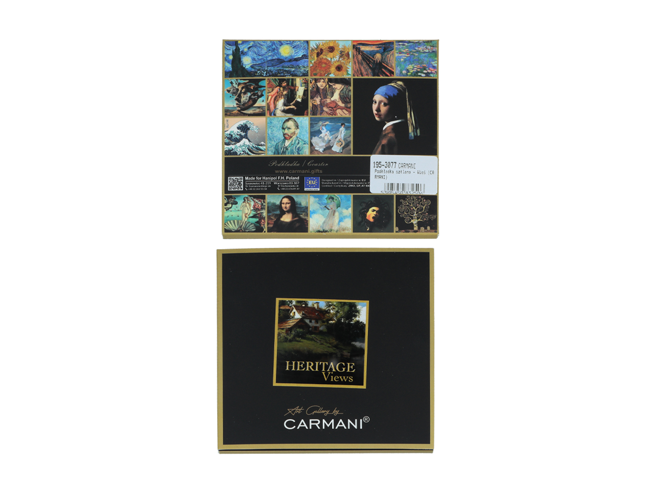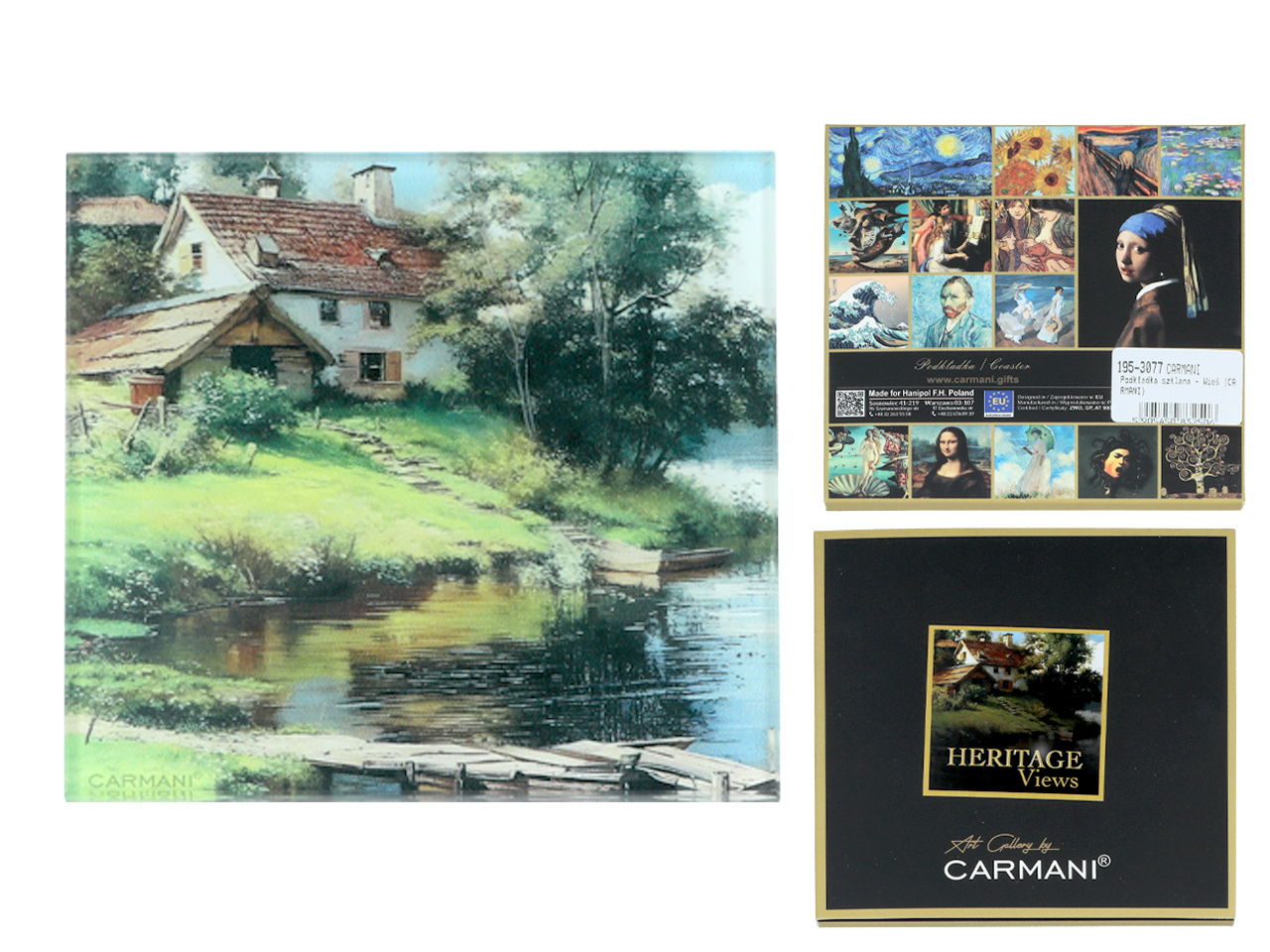 Gustowna, kwadratowa podkładka szklana pod kubek przedstawia malownicze sceny z życia dawnej wsi ? drewniane chaty kryte strzechą, złote łany zbóż, studnie, drewniane płoty oraz codzienne życie gospodarzy i zwierząt.