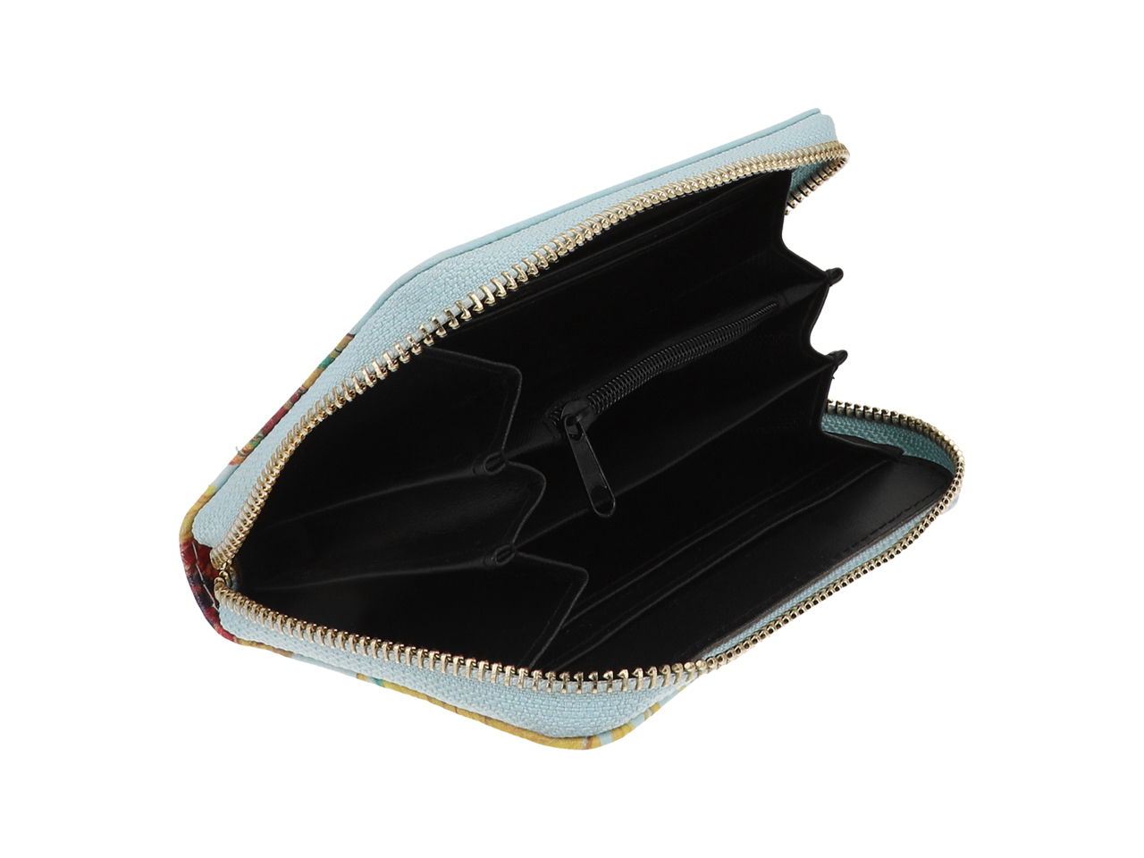 Pięknie ozdobniony portfel na suwak. Posiada przegródki na banknoty, karty płatnicze, wizytówki oraz zamykaną kieszonkę na monety.
