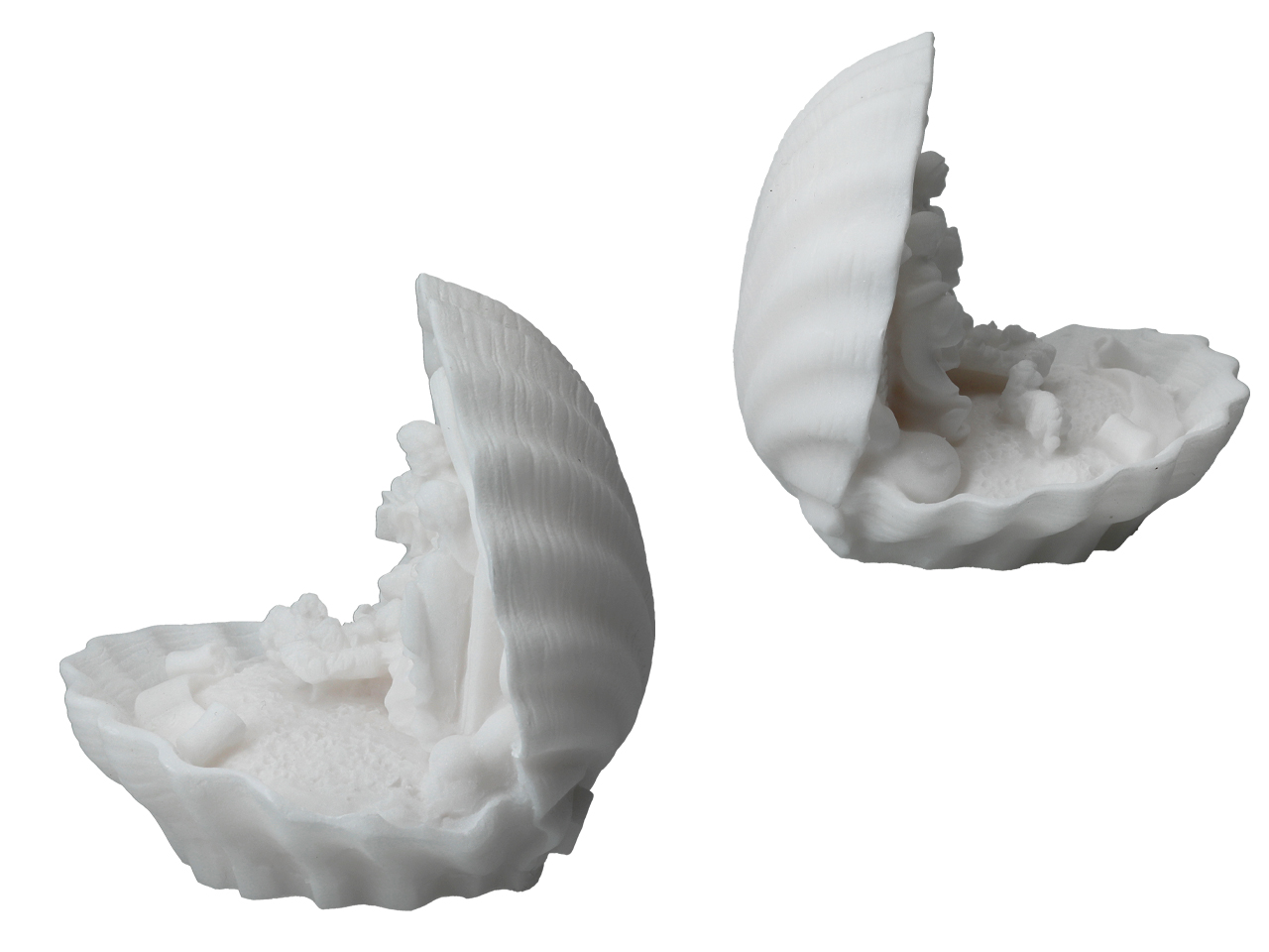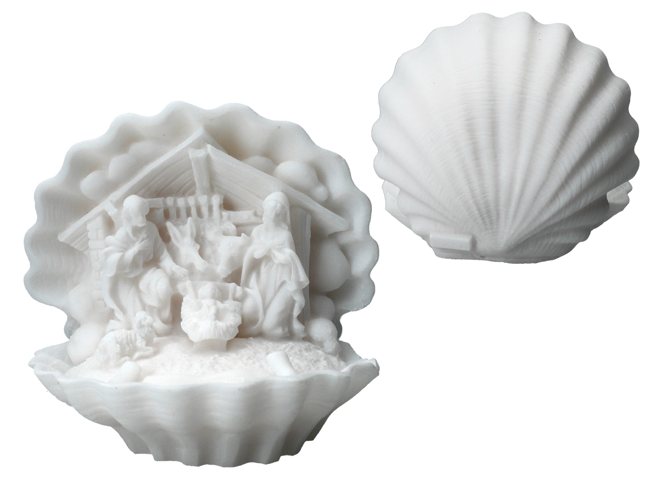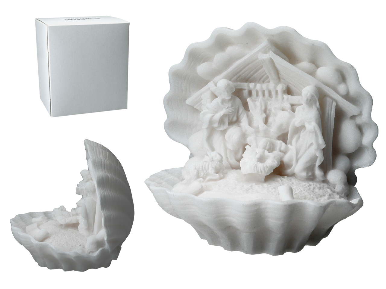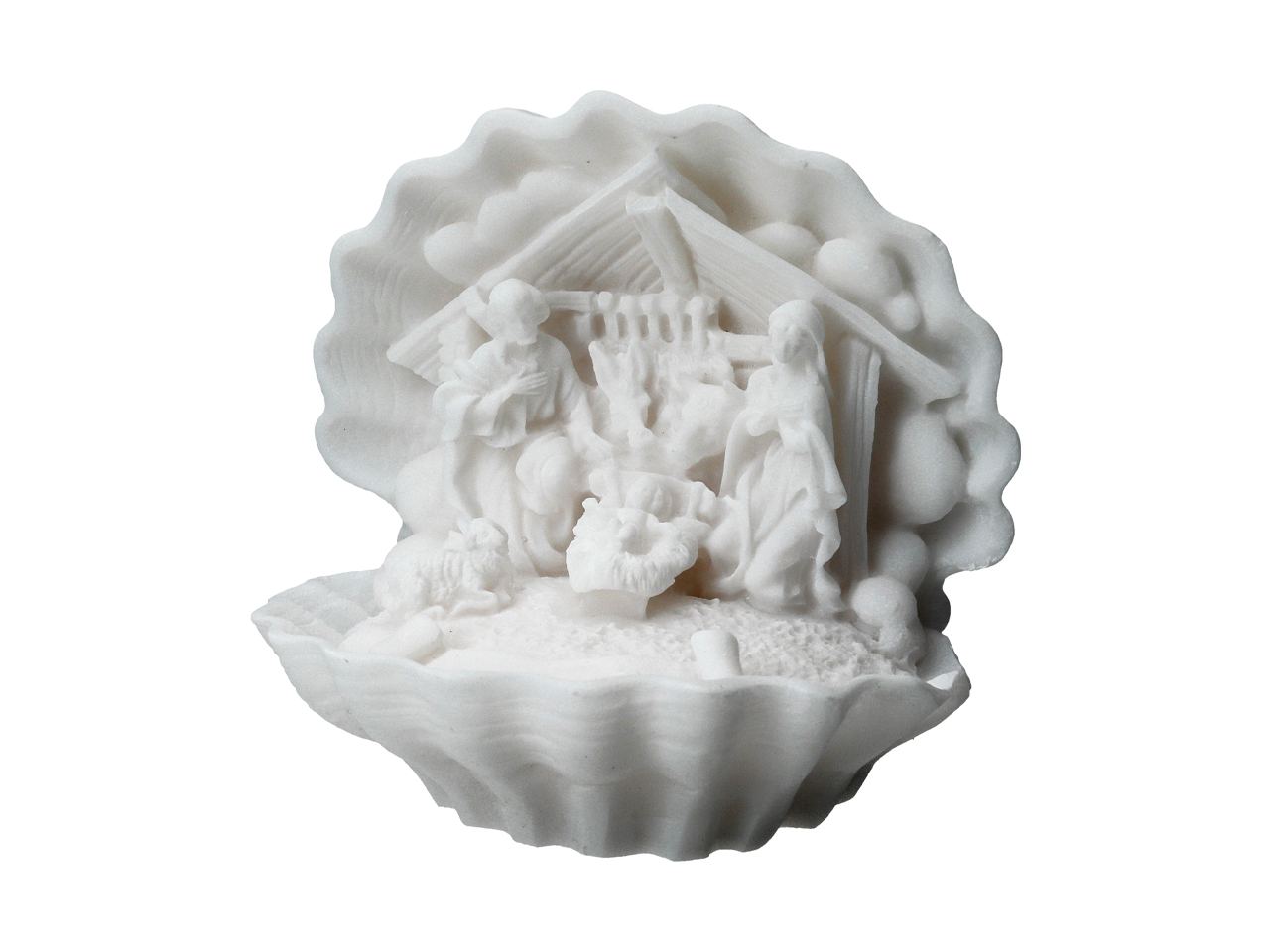 Alabastrowa figurka przedstawiająca stajenkę betlejemską. Całość została osadzona w muszli morskiej. Od czasów starożytnych alabaster był wysoko cenionym kamieniem ozdobnym i dekoracyjnym. Niezliczona ilość wzorów stanowi inspirację do tworzenia