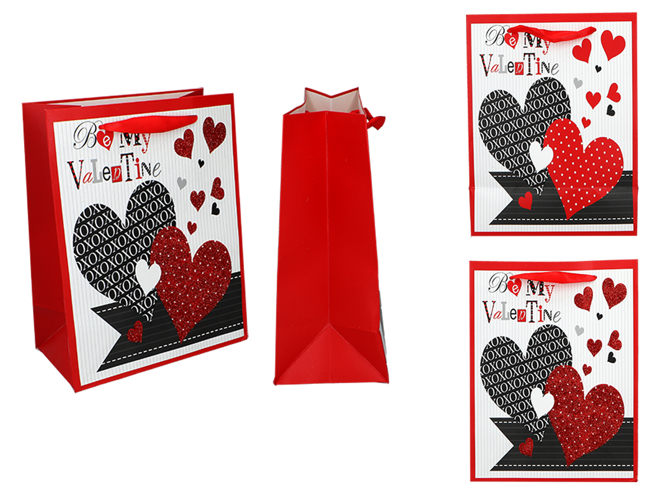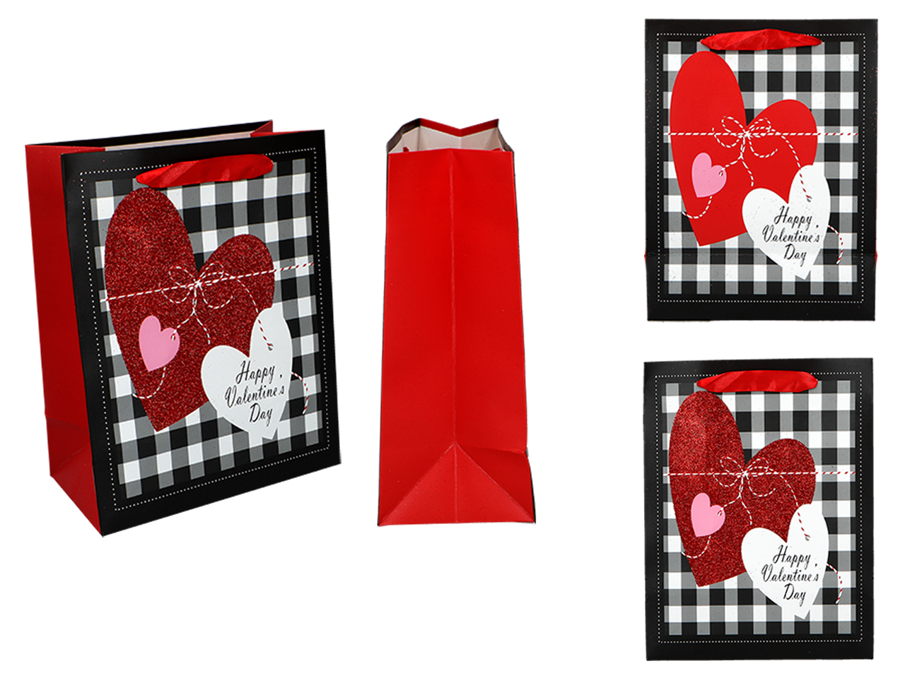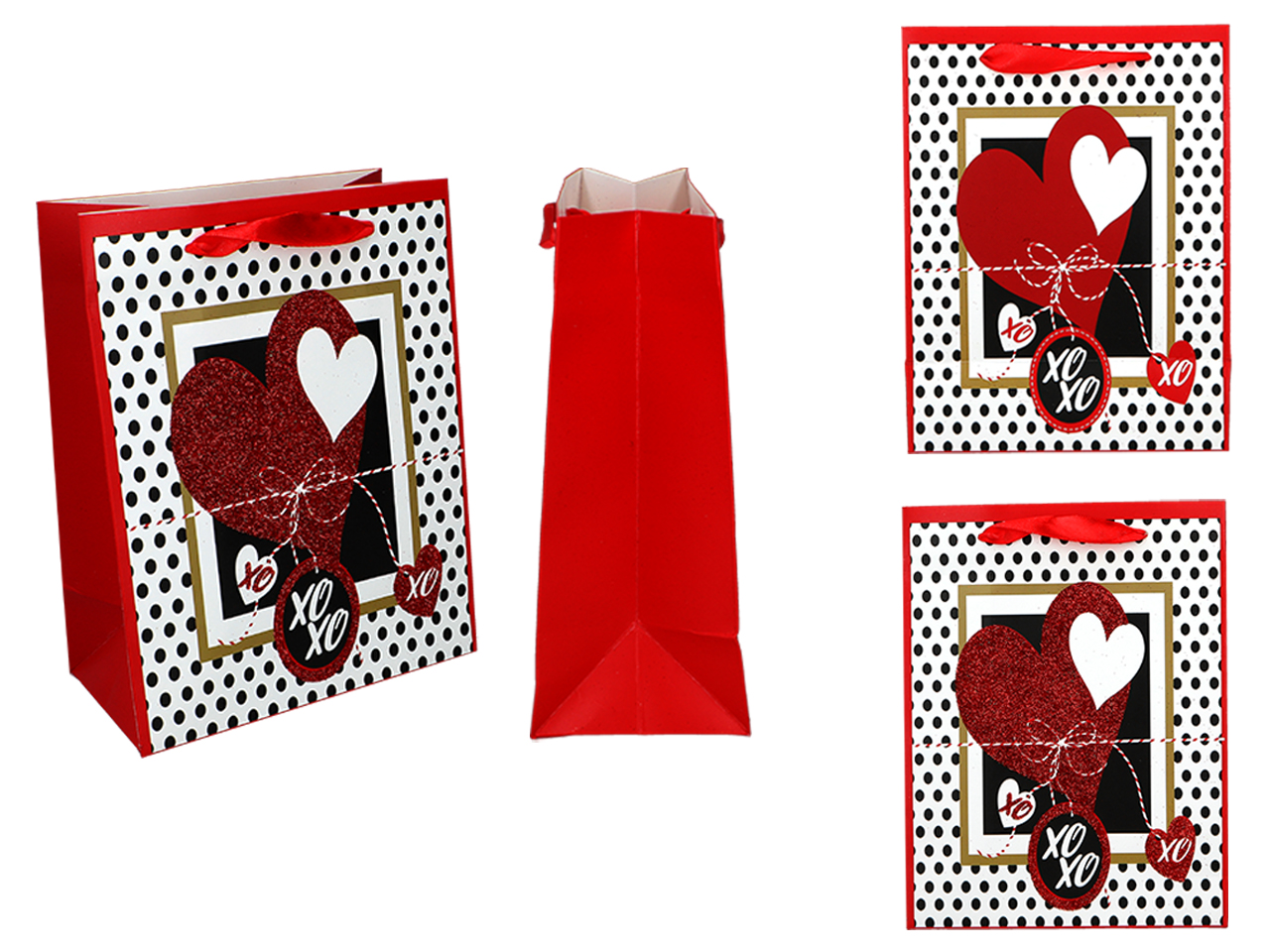 Torebka z motywem walentynkowym to uroczy dodatek, idealny do pakowania upominków na dzień zakochanych. Wykonana z wysokiej jakości papieru, ozdobiona czerwonymi akcentami, nadaje się doskonale do wręczania romantycznych prezentów.