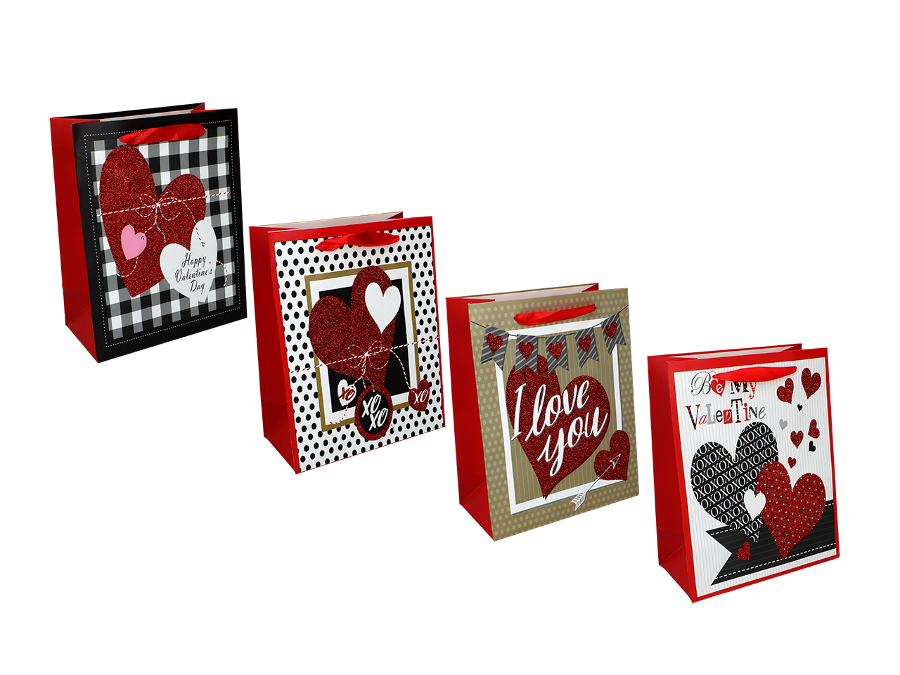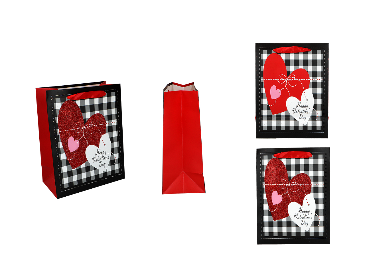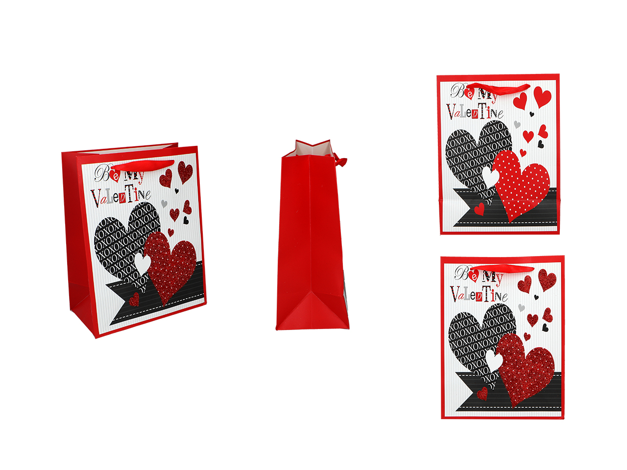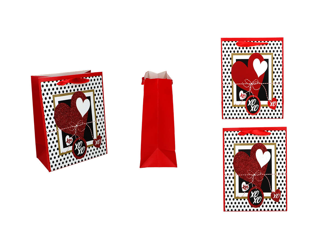 Torebka z motywem walentynkowym to uroczy dodatek, idealny do pakowania upominków na dzień zakochanych. Wykonana z wysokiej jakości papieru, ozdobiona czerwonymi akcentami, nadaje się doskonale do wręczania romantycznych prezentów.