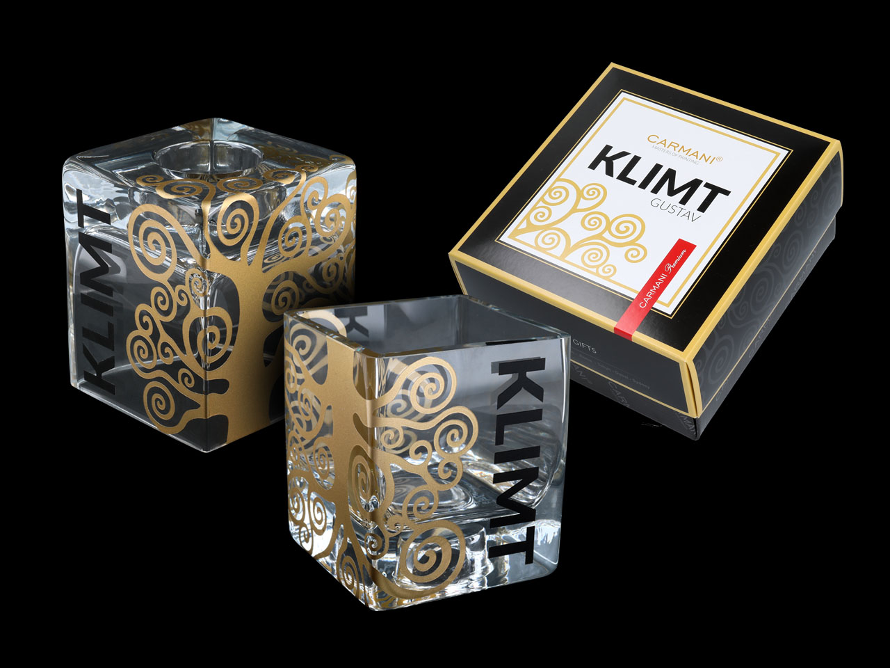 Praktyczny i elegancki jednoczeście – wazon szklany, który po odwróceniu zamienia się w nowoczesny świecznik. Całość ozdobiona motywem Drzewa z obrazu Gustawa Klimta. To delikatny i bardzo symboliczny motyw, który doskonale prezentuje się na szkle.